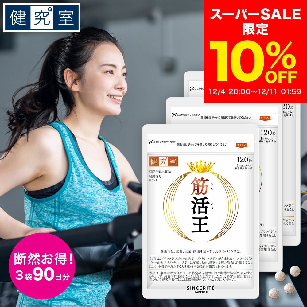 【10%OFF 12/4〜12/11】筋活王 [機能性表示食品] 3袋セット(90日分) ◆ サンセリテ サプリメント 健康食品 国産 筋肉 アミノ酸 ふしぶし ブラックジンジャー イミダゾール βアラニン コラーゲン エラスチン 大豆たんぱく 乳タンパク