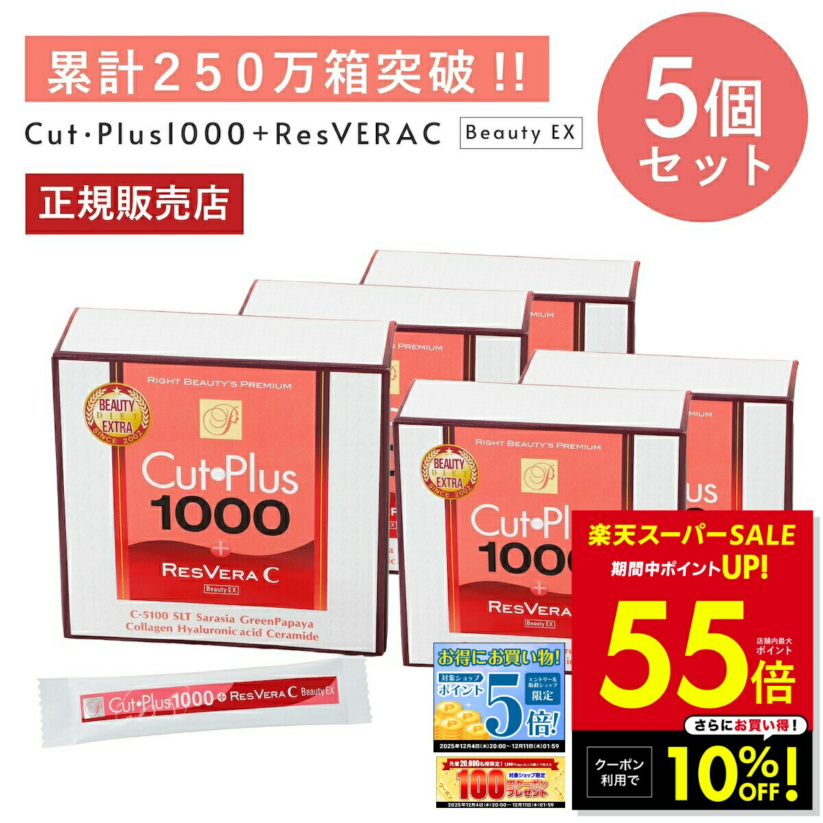 【SS★10%OFFクーポン!! 〜12/11 1:59】カットプラス 1000 レスベラC 2.2g×30包 お得な5個セット ダイエット サプリメント C-5100株 乳酸菌 レベストラトール ビタミンC 腸内環境 美容サポート 腸内フローラ 青パパイアエキス 健康食品 腸活 サプリ 楽天ロジ 送料無料 p20