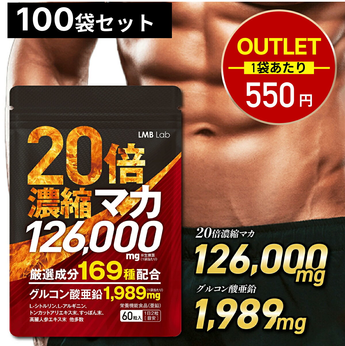 【在庫処分】100袋セット 1袋あたり550円 マカ サプリ 126000mg ★アウトレット品のため返品不可 20倍濃縮 亜鉛 サプリ シトルリン アルギニン サプリメント メンズサプリ30日分 60粒 男性用 活力 男性 すっぽん トンカットアリ 高麗人参 日本製 GMP認定工場 LMBLab