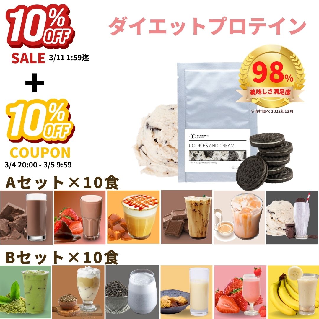 【10%OFFセール】人工甘味料不使用 美容プロテイン 個包装20g×10食セット ダイエット 女性 お試し ソイ ホエイ カゼイン PeachPick ピーチピック トライアル 甘さ控えめ