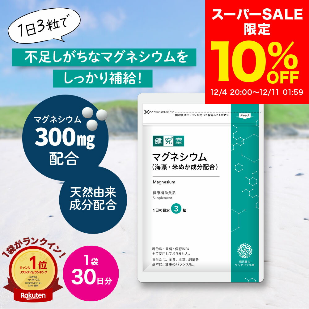 【10%OFF 12/4〜12/11】マグネシウム 300mg 1袋(30日分) サプリ ミネラル 天然 海藻 米ぬか成分 健康食品 国産 GMP 女性 男性 サポート サプリメント 健康食品 ヘルスケア 納豆 おすすめ プレゼント 送料無料