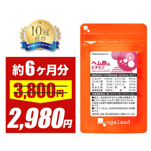 【大特価SALE】【お得な大容量】ヘム鉄 & ビタミン(約6ヶ月分) 送料無料 鉄 鉄分 サプリメント ミネラル おすすめ 鉄分補給 ダイエット 鉄分不足 食事で不足 ヘルスケア 大容量 半年分 ヘルスケア 気になるお悩みに 亜鉛との相性抜群 オーガランド ポイント消化 送料無