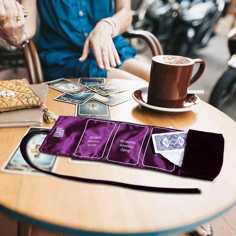タロットカード収納ポーチ 携帯用 ロールアップ式 巻きポーチ ベルベット調 サテン生地 多機能 マルチ収納 旅行用 トラベル 卓上 小物入れ カードケース オラクルカード ルーン パープル(x300)
