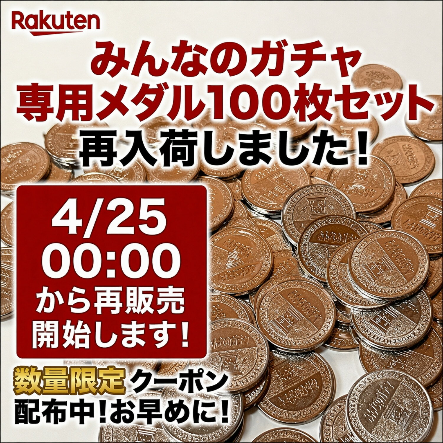 【4/25限定】先着20名!店内全品10%OFFクーポン ガチャガチャ メダル みんなのガチャ専用 100枚セット