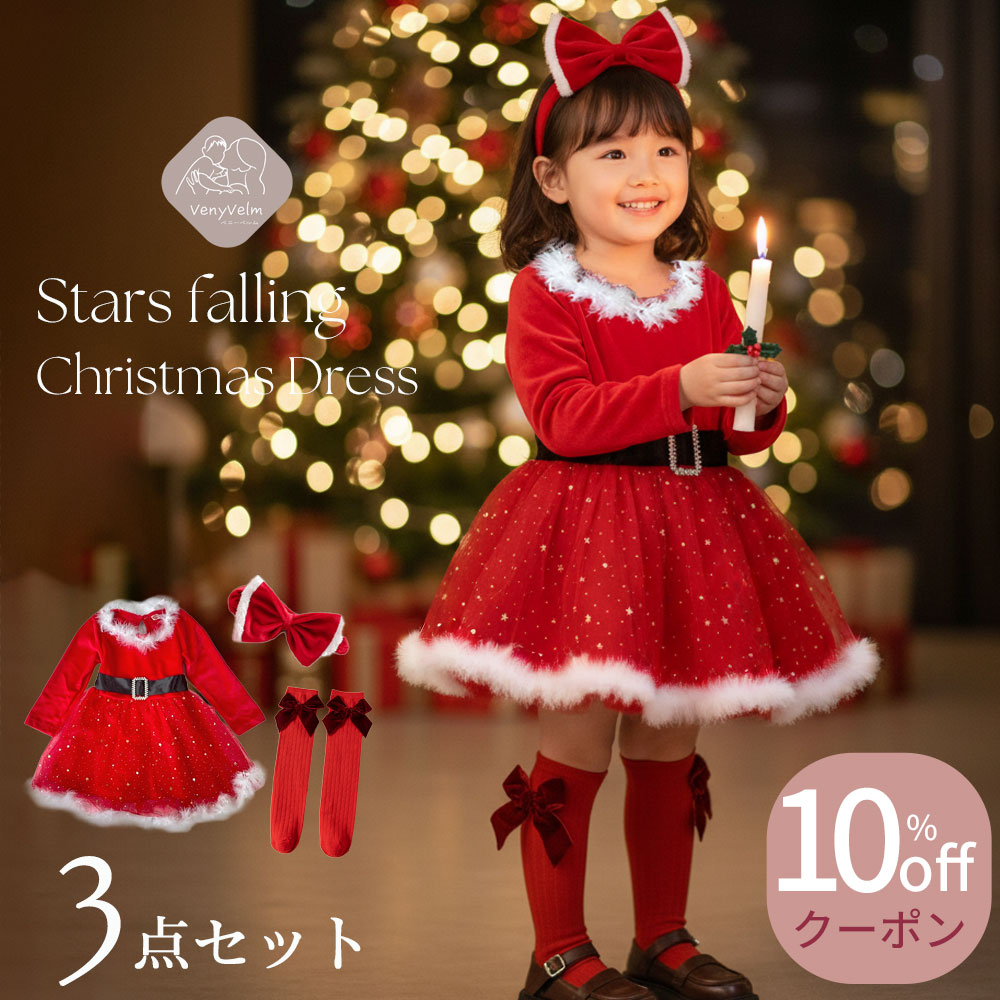 【クーポンで10%OFF!(12月1日終了)】3点セット クリスマス ワンピース 女の子 キッズ 子供 サンタ サンタクロース 衣装 ドレス カチューシャ リボンソックス 長袖 赤 100 110 120 130 140cm