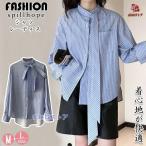 ストライプ シャツ ブラウス リボン レディース 春夏秋 オフィス 通勤 長袖 上品 ノーカラー ワイシャツ スーツ シンプル インナー トップス ビジネス UVカット