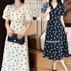 ワンピース レディース パフスリーブ 花柄 総柄 vネック 着痩せ ネイビー ベージュ 体型カバー ロングワンピース 上品 シンプル おしゃれ 女性 きれいめ かわい