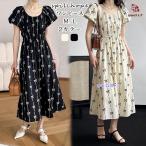 ワンピース レディース リボン 総柄 パフスリーブ ブラック ベージュ ロングワンピース 上品 シンプル おしゃれ 女性 きれいめ かわいい ウエストゴム 体型カバ