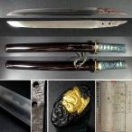 敬逢 秀逸 刀剣 無銘 日本刀 短刀 皆焼刃文 朱塗漆鞘鮫皮柄拵え 鉄地金銀象嵌鐔 宗典銘 素銅地縁頭 武具図目貫 78