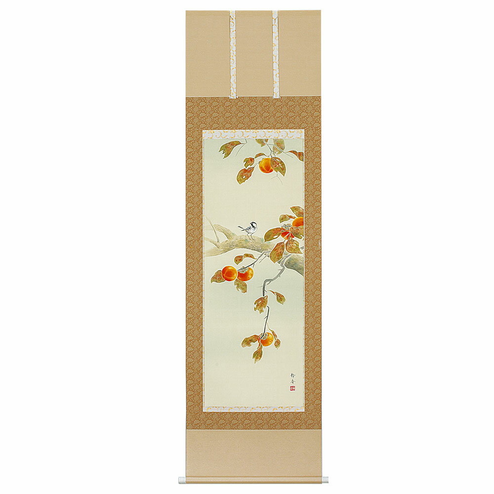 掛軸 北条静香 「柿に小禽」 尺五立 日本画 真筆 手描き 花鳥 掛け軸 表装済み 桐箱収納 シジュウカラ 秋の季節掛け 普段掛け A-1801