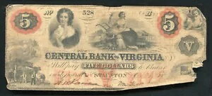 1860年 $5 バージニア中央銀行スタントン、バージニア州旧紙幣 (AG)