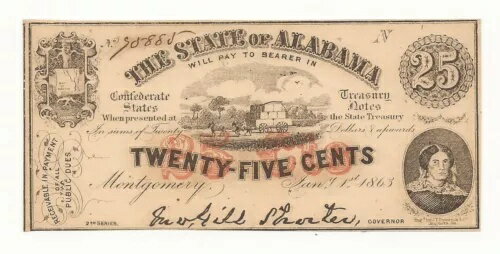 アラバマ州連合国 1863年 25セント 旧紙幣、CR-6/CU