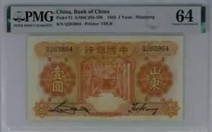旧紙幣 中国銀行 1934年 刷り重ね 山東省紙幣 1元 PMG 64