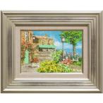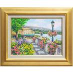 生田 明 「 海の見えるテラス 」 油絵 ・ 油彩画 SM ( サムホール ) 絵画 洋画 肉筆 手描き 真筆 外国の風景 海外の風景 海 青空 花 小さめ 小さい 送料無料