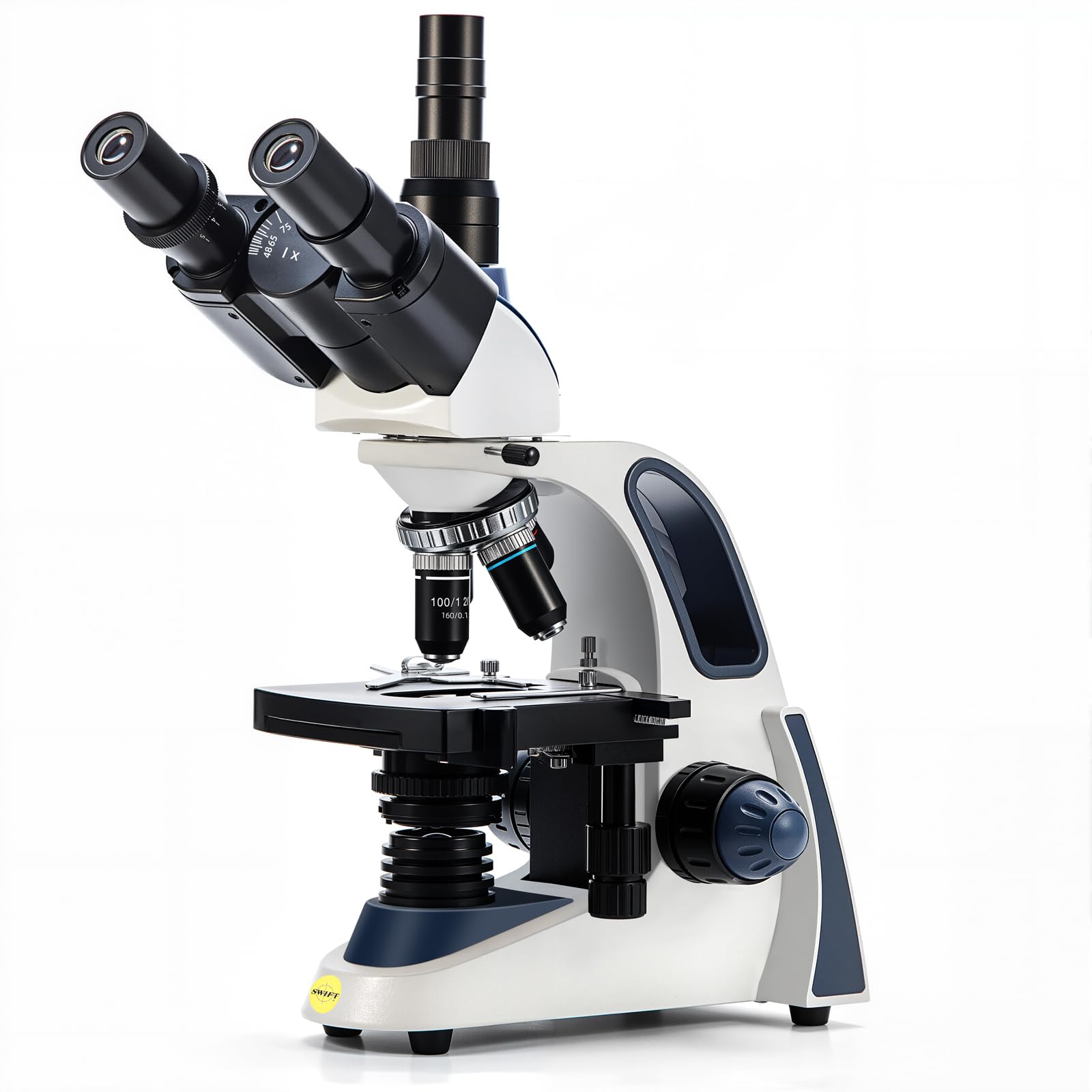 SWIFT 三眼生物顕微鏡 高性能3眼タイプ生物顕微鏡 最大2500X拡大、ジーデントップ式30度傾斜三眼鏡筒、1W LED照明 研究用、実験用生物顕微鏡、広視野接眼レンズ10倍と25倍、一体型XYステージ、アッベコンデンサー SW380T