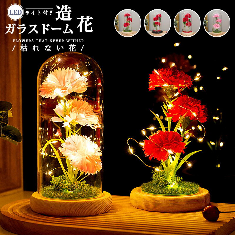 【20%OFFクーポンで、11/27まで】プリザーブドフラワー ガラスドーム カーネーション 3輪 おしゃれ 母の日 プレゼント LEDライト キラキラ 記念日/誕生日 お見舞い お礼 初盆 お盆 手元供養