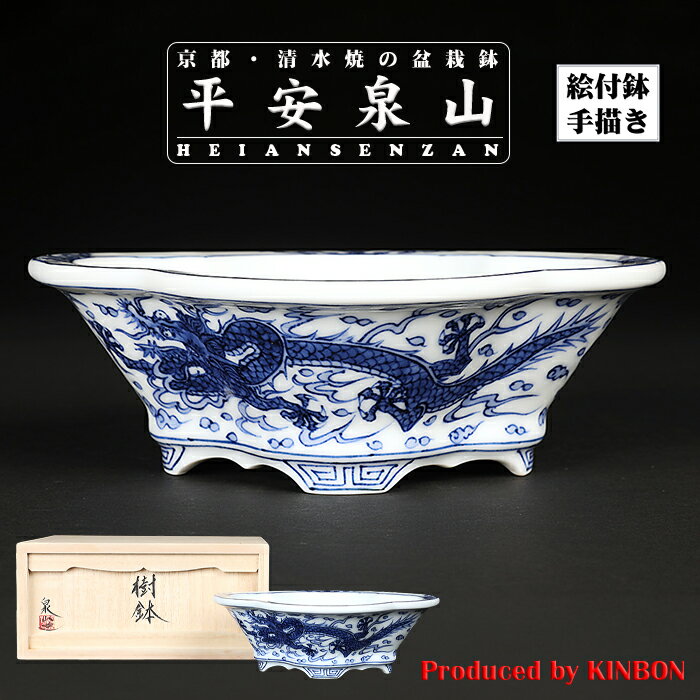 盆栽鉢 植木鉢 「平安泉山染付雲龍図木瓜式鉢 大」 絵付 絵鉢 清水焼 京焼 呉須 6号 17cm 共箱 保証書付き 小品盆栽 ミニ盆栽に最適 【送料無料】