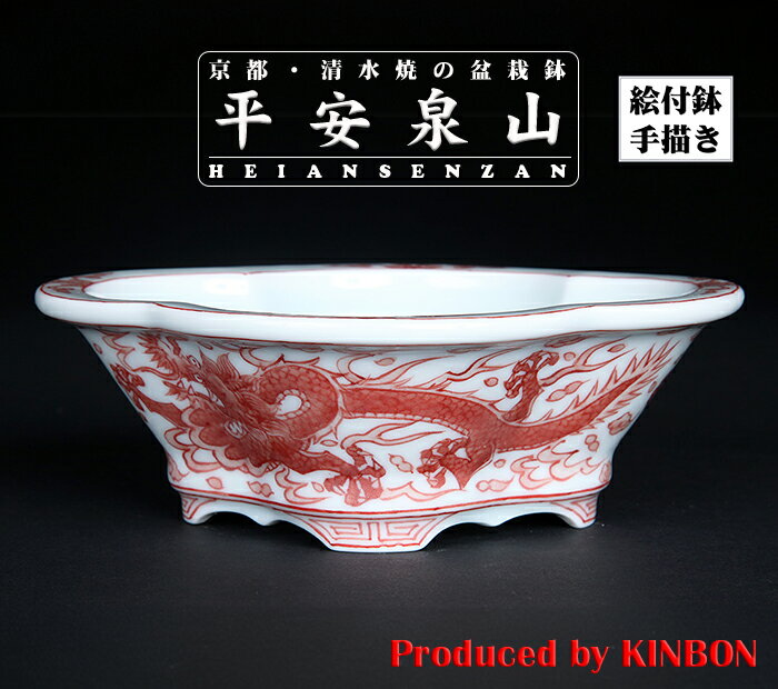 盆栽鉢 植木鉢 「平安泉山赤絵雲龍図木瓜式鉢 大」 絵付 絵鉢 清水焼 京焼 呉須 6号 17cm 共箱 保証書付き 小品盆栽 ミニ盆栽に最適 【送料無料】