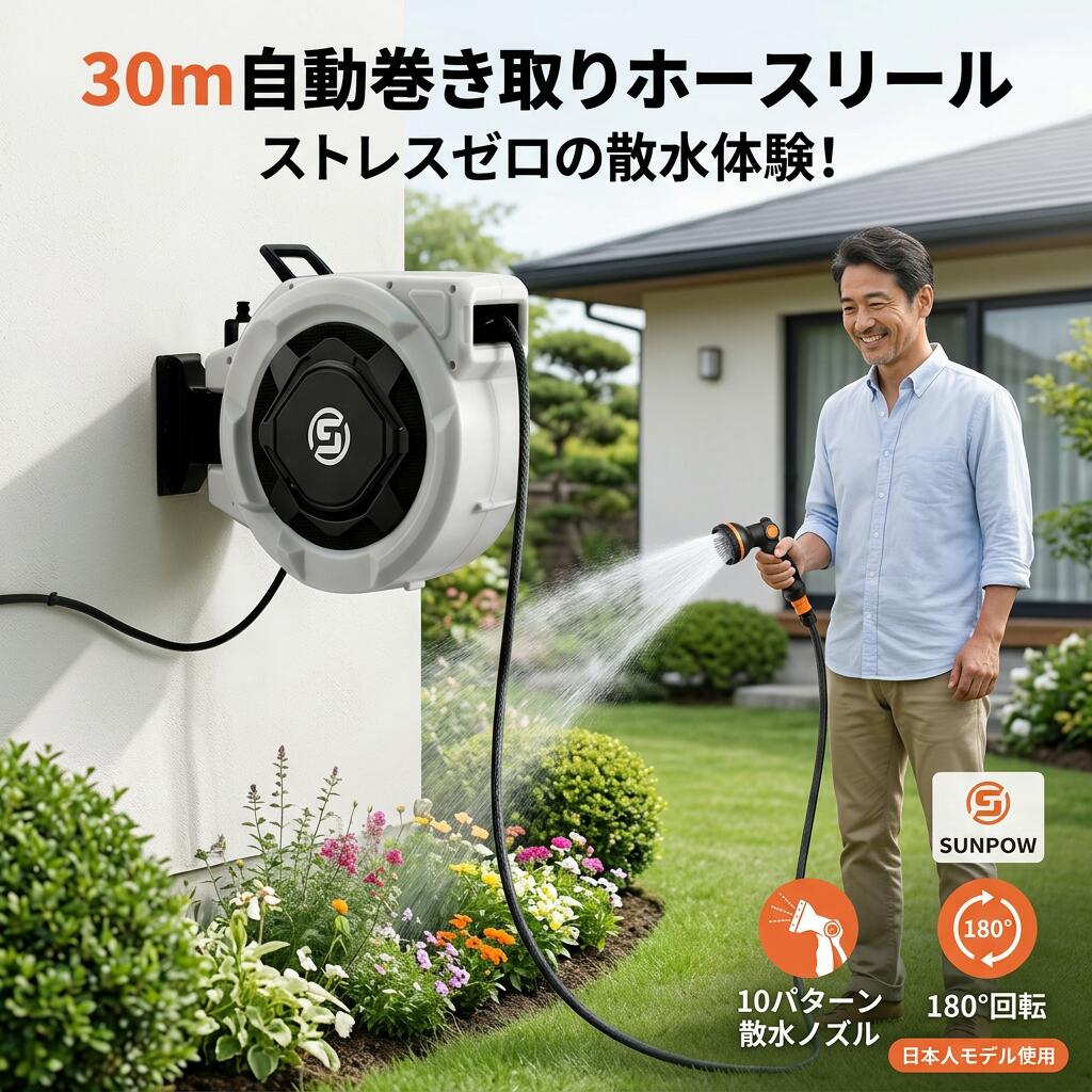 【店内全品20%OFFクーポン配布中】SUNPOW ホースリール 自動巻き取り 散水ホース 壁掛け 180°回転 ブラケット付 10パターン散水ノズル 絡まらない 緩衝回収 散水/洗車/掃除/園芸 日本語説明書付