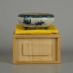【中古】盆栽鉢 大助 小鉢 長辺 約 9.3cm 丸鉢 染付 山水図 雪 舟 風景 模様 箱付 布付 鑑賞 観賞用 現品 中古鉢