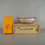 盆栽鉢 九谷 有朋 小型 長辺 約 18cm 木瓜鉢 赤絵 窓抜 山水図 花 模様 共箱 共布 鑑賞 観賞用 現品 新品