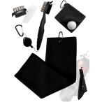 ゴルフタオル カラビナ付き クラブ拭き ボール拭き 伸縮式リール付アイアンブラシ 3点セット マイクロファイバー フック (ブラック)