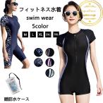 フィットネス水着 体型カバー ワンピース 2点セット オールインワン ジップ パット付き 競泳 タンキニ スイムウェア スイム 女性用 半袖 ビーチ サーフィン 水泳