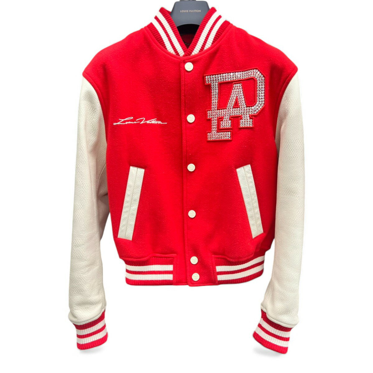 【未使用】 2024AW ミックスレザーバーシティブルゾン ダミエ エンボス レザー × ウールメルトン レジンパール LV ロゴ シグネチャー 刺繍 ストラス PA パッチ スタジャン ジャケット アウター メンズ サイズ 56 XL相当 レッド ファレル・ウィリアムス期【中古】