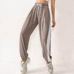 配色 ライン ギャザー フィットネス パンツ 女性 レディース ボトム ズボン スウェット ジャージ 9分丈 単色 無地 腰高設計 ハイウエ