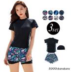 \9%OFFクーポン/フィットネス水着 レディース セパレート ママ水着 かわいい 大きいサイズ 体型カバー水着 半袖ラッシュガード 水泳帽子 3点上下セット 20代 30代 40代 50代 60代 ミセス LL 3L 4L 5L 露出控えめ 二の腕 ウエスト お尻 太もも カバーアップ 黒