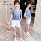 子ども服 キッズ 女の子 夏服 オシャレ セットアップ ストライプ柄 Tシャツ 半袖 ショーツ ホワイト 2点セット 通学着 記念日 姉妹 上下セット 夏着 120-170