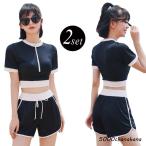 フィットネス水着 レディース 体型カバー 半袖ラッシュガード 2点セット ジム 20代 30代 40代