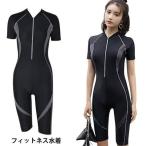 フィットネス水着 レディース オールインワン ハーフパンツ 半袖 ストレッチ ワイヤーレス パッド付き フロントジップ 水泳 練習用 競技水着 伸縮性