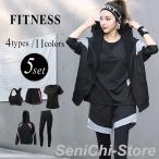 スポーツ ヨガウェア 体型カバー レディース 5点セット 長袖 パーカー フード フロントファスナー 半袖 Tシャツ ロゴ ブラ 黒 白