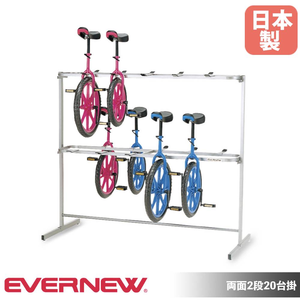 一輪車ラック 両面 2段 20台掛 エバニュー 幅162×奥行70×高さ140cm スチール製 保護キャップ付 脚部高さ調節アジャスター付 一輪車収納 部活 日本製 EKD119