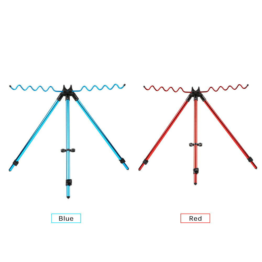 釣り竿 三脚 ロッドスタンド 竿受け 伸縮式 アルミ合金 9本対応 軽量550g 折りたたみ 高さ61〜107cm 収納67cm 投げ釣り 海釣り 湖畔 サーフ 磯 レッド/ブルー 調整ラッチ付き