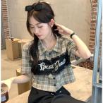 チェック ショート丈 シャツ ブラウス 半袖 五分袖 短い 短め ロゴ デニム ワッペン ス カットソー 切替 ブラック ダンス 衣装 ヒップホ