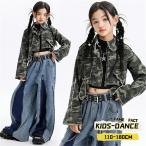 ヒップホップ キッズ ダンス衣装 セットアップ 迷彩ジャケット 女の子 へそ出し トップス デニムパンツ ワイドパンツ ジャズ ダンスウエア 舞台衣装 ガールズ ス