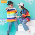 激安 虹Tシャツ サルエルパンツ デニムパンツ キッズ ダンス衣装 ヒップホップ ジャズダンス チア チアガール HIPHOP 女の子 ステージ 演出服 応援団 練習着