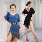 ラテン ダンス衣装 レディース ラテン 専門 練習着 レッスンウエア ワンピース ベルト付き Vネック 半袖 ショート丈 裾フリンジ 斜め 三角形裾 ミニ丈 ダンス ド