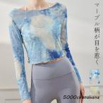 ヨガ トップス レディース 長袖 シアートップス ショート丈 ピラティス マーブル 水彩 フリル シースルー スポーツ フィットネス ジム ダンス