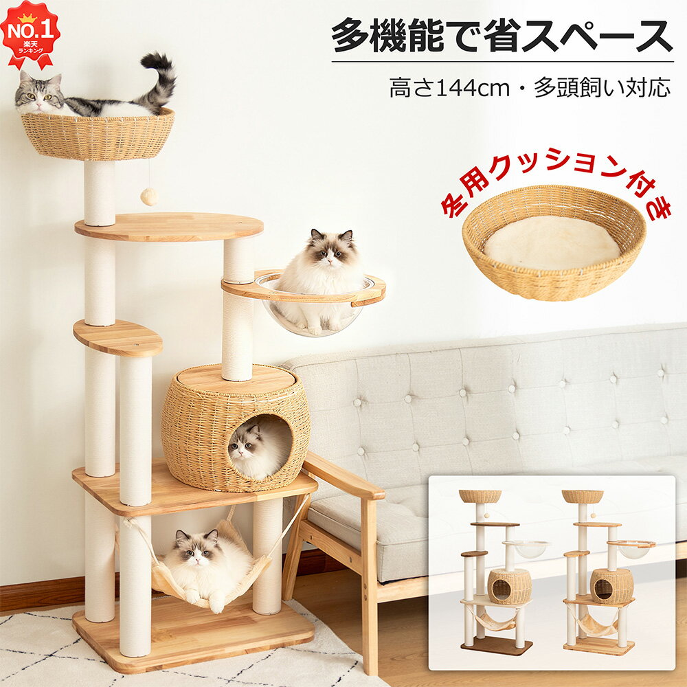 あす楽 キャットタワー 木製 据え置き 冬用 クッション付 もこもこベッド 大型猫 おしゃれ 省スペース ラバーウッド 手編みカゴ インテリア性 多頭飼い スリム 木目 見晴台 猫タワー 宇宙船 クリアボウル 爪研ぎポール ハンモック コットン紐 人気 運動不足解消 ストレス発散