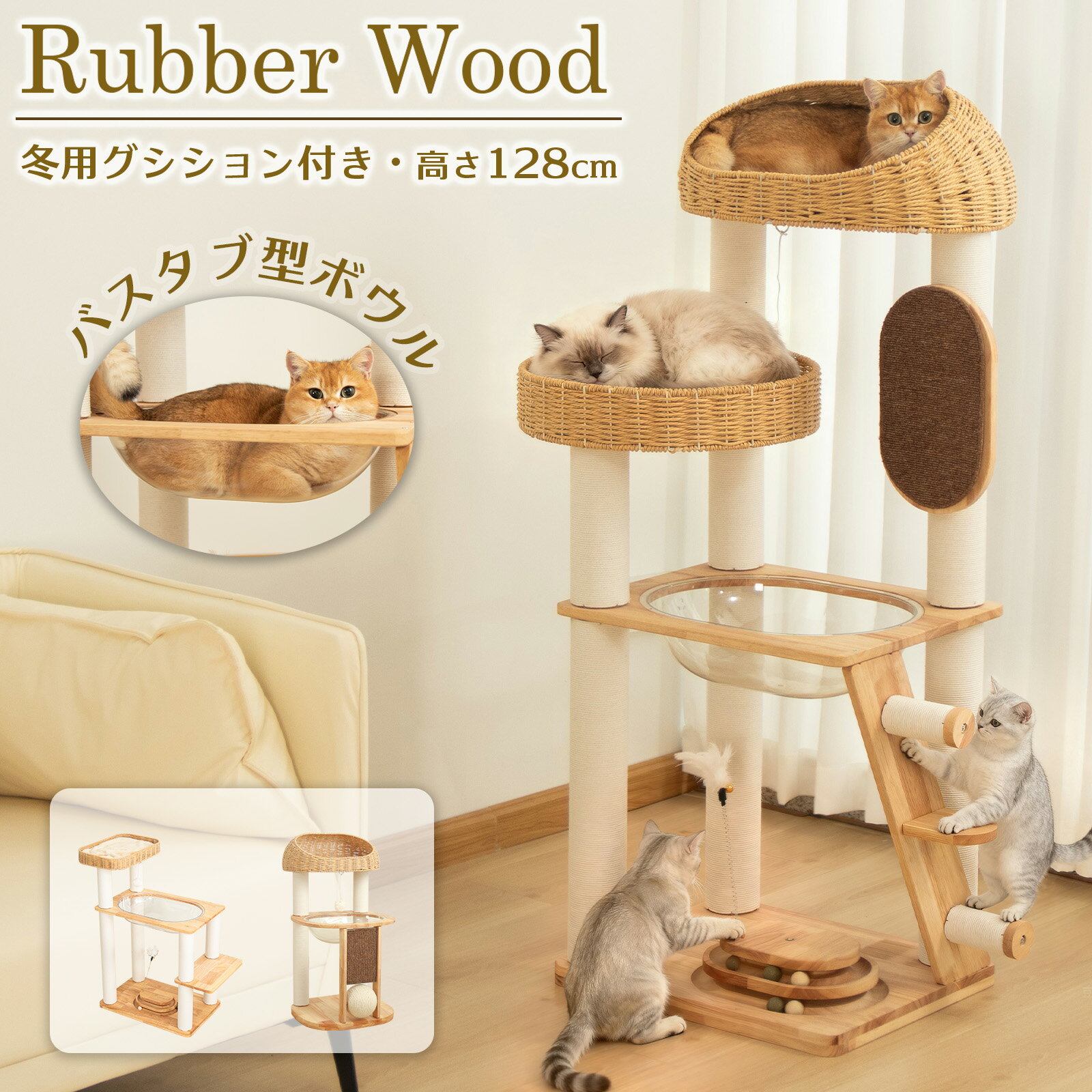 キャットタワー 木製 大型猫 おしゃれ 天然木使用 据え置き 大型 ラバーウッド 手編みカゴ インテリア性 多頭飼い スリム 夏冬兼用 見晴台付き 猫タワー 宇宙船 クリアボウル 中型猫 爪研ぎ ハンモック コットン紐 高さ122cm 安定 運動不足解消