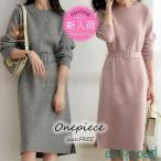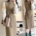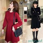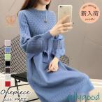 ニットワンピース 40代 オシャレロングワンピース 春秋冬 長袖ワンピース 無地リボンAラインスカート ニットインナー セーター ゆったり韓国風大人30代50代
