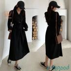 ワンピース レディース 40代ワンピース 秋冬新作 長袖ワンピース きれいめ シャツワンピース 黒 vネック ロング丈スカート オシャレ 通勤 カジュアル 大人