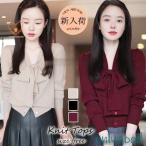 ニットス レディース 秋冬 40代 長袖セーター無地 リボンVネック ショット丈セーター ゆったりプルオーバー オシャレ韓国風 大人ニットインナー 50代