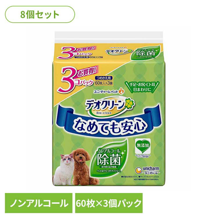 【8個セット】デオクリーン ノンアルコール除菌ウェットティッシュつめかえ用 60枚×3個パック 犬 猫 詰め替え用 お手入れシート 足 おしり ペット用 まとめ買い ノンアルコール なめても安心 ペット 除菌 無香料 ユニ・チャーム ペットケア