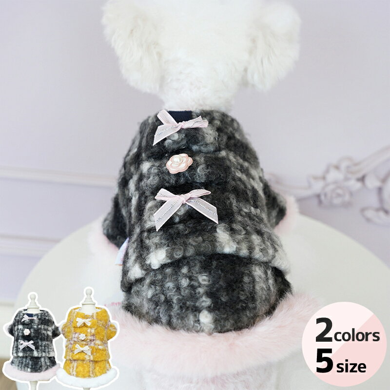 犬服 猫服 いぬ服 ねこ服 秋冬 小香風 ツイード風 コート リボン パールボタン付き 暖かい ファー付き チェック柄 ジャケット おしゃれ 上品 小型犬 ドッグウェア ドレス ワンピース 上品 お呼ばれ ペットウェア チワワ トイプードル イエロー ブラック 黄 黒 チェック