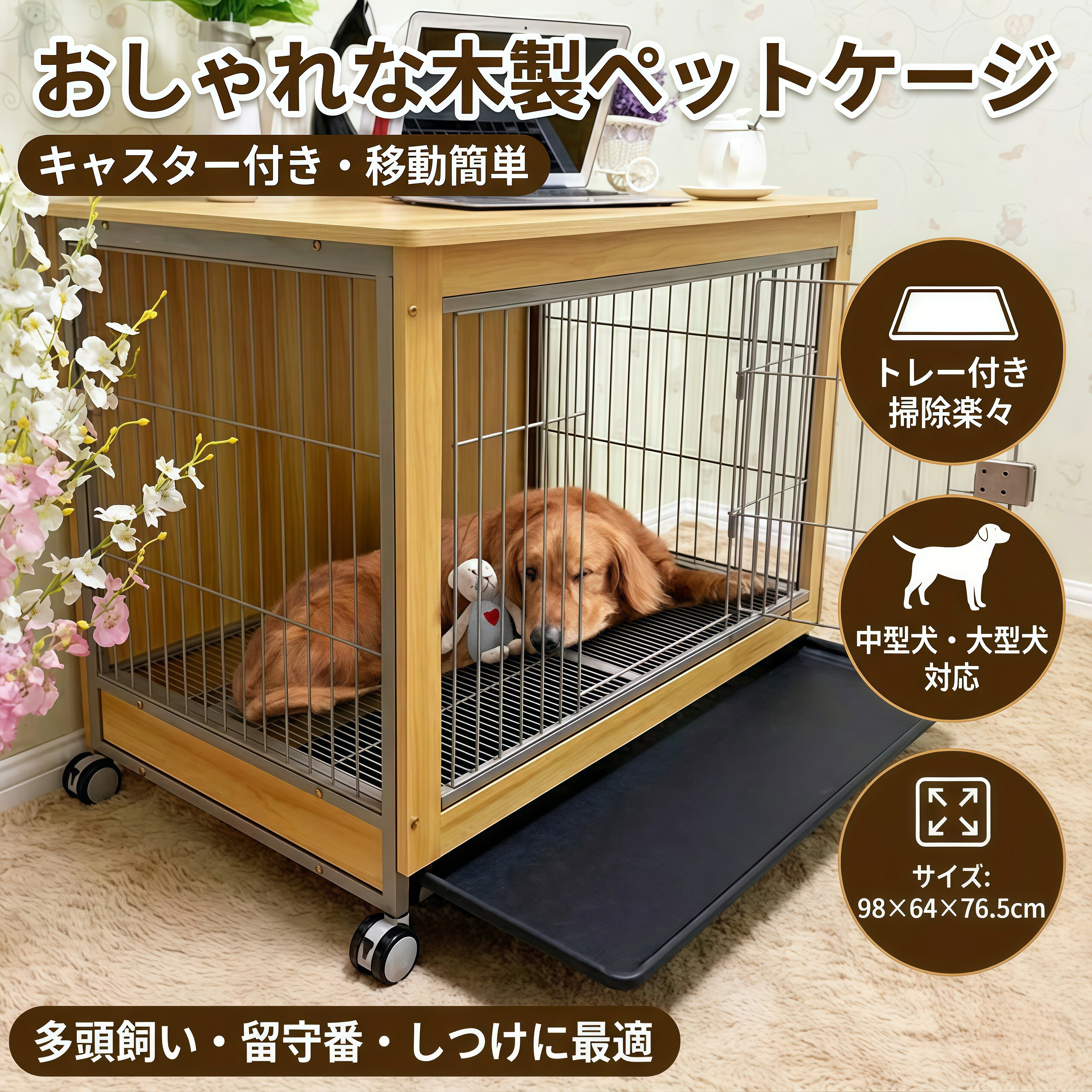 犬ケージ ペットケージ 木製ケージ 室内用 サークル おしゃれ ウッディ 犬小屋 中型犬 大型犬 対応 キャスター付き トレー付き 移動簡単 インテリア ナチュラル ダークブラウン 多頭飼い 留守番 しつけ用 ペットハウス 98×64×76.5cm