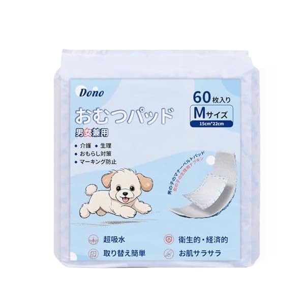 犬おむつパッド マナーベルトや洗えるパンツと一緒に使用のマナーパッド ペット用おしっこ吸収おむつウェア もれない 使い捨て犬用マナーパッド 超吸収 女の子や男の子兼用おむつパッド 介護 おもらし マーキング防止などに使えるペット用オムツMサイズ60枚